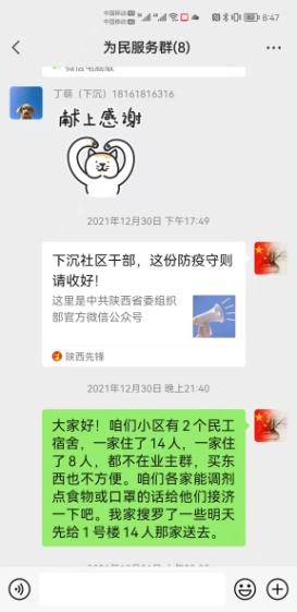 看著手里拎的幾顆白菜、蘿卜、西紅柿,我感到慚愧難當(dāng),作為一名黨員、一名下沉干部,實(shí)在是失職,沒有履行好“民之所憂,我必念之;民之所盼,我必行之”的使命擔(dān)當(dāng)。投送完愛心菜到家后,我立即在群里倡議小區(qū)下沉干部對1-3-2302的務(wù)工人員開展愛心救助活動(dòng),并從自家的抗疫儲(chǔ)備物資里勻出了2袋子蔬菜、豆腐乳、魚醬罐頭、口罩、水果等物資,并附上了溫馨小紙條,寫上我的聯(lián)系電話,鼓勵(lì)他們堅(jiān)定克服困難的信心和決心。第二天,社區(qū)領(lǐng)導(dǎo)、小區(qū)鄰居們得知情況后,紛紛伸出援助之手,不到半小時(shí),鍋灶有了、菜刀案板有了、糧食蔬菜也都有了…,社區(qū)的慰問品也送來了。大伙不僅給他們送去了物資,更送去了關(guān)心和安慰,他們的生活起居也迅速融入了小區(qū)大家庭,業(yè)主群里每天都有人對他們噓寒問暖,他們也經(jīng)常在業(yè)主群曬他們做的川味美食。他們私下跟我說,這幾年,他們在湖北、新疆等地都遇到過疫情,但最讓他們感動(dòng)的還是西安,黨和政府的細(xì)致安排、西安人民的熱情相助,讓他們在他鄉(xiāng)異地孤立無援時(shí),第一次感到不慌了。