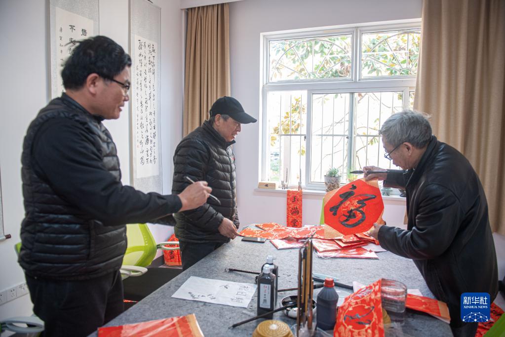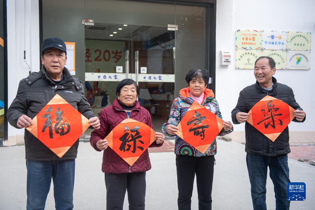 1月18日,江北區(qū)桃源小區(qū)的居民在“長者之家”寫“福”字。該小區(qū)老年人居住比例較高,在老舊小區(qū)改造過程中,街道將小區(qū)內閑置用房改造成集老年大學、幼兒托管等為一體的“長者之家”。新華社記者 江漢 攝