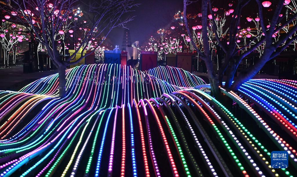 春節(jié)臨近,西安市大唐不夜城點亮璀璨奪目的燈光,迎接新春佳節(jié)的到來。