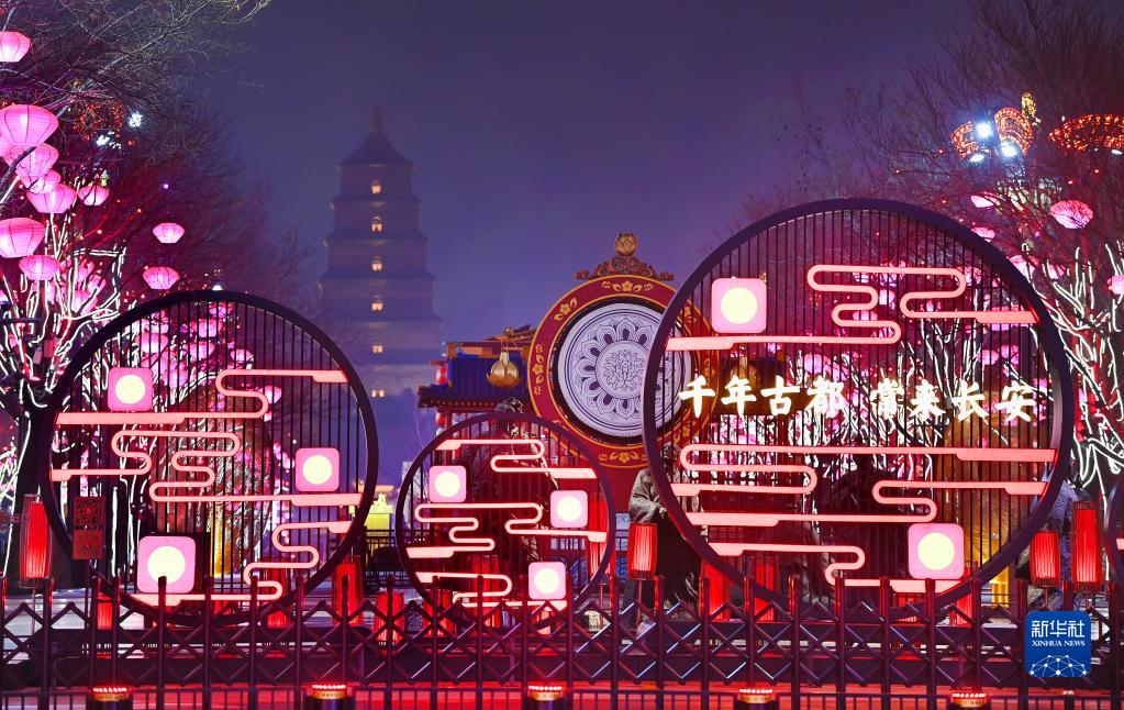 1月21日拍攝的大唐不夜城夜景。春節(jié)臨近,西安市大唐不夜城點(diǎn)亮璀璨奪目的燈光,迎接新春佳節(jié)的到來(lái)。新華社記者 陶明 攝