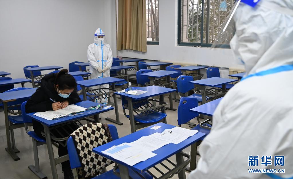 在2022年全國(guó)碩士研究生招生考試西安外國(guó)語(yǔ)大學(xué)考點(diǎn)隔離考區(qū),監(jiān)考人員在單人隔離考場(chǎng)監(jiān)考??荚囍?,監(jiān)考人員全程著防護(hù)服工作,學(xué)生午休時(shí)不出考區(qū),學(xué)校為每名考生提供免費(fèi)午餐。各方全力以赴為考生“保駕護(hù)航”,確??荚図樌M(jìn)行。新華社記者 劉瀟 攝