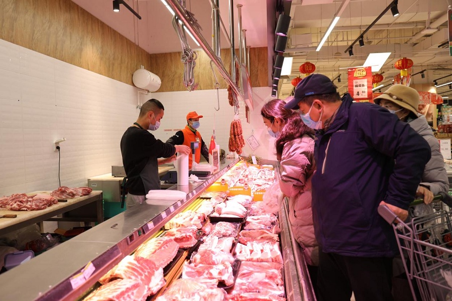 在蔬菜區(qū)、水產(chǎn)區(qū)、肉類區(qū),工作人員稱重、打包,忙得不亦樂乎。“今天一大早就有不少群眾來,各種肉類和火鍋食材賣得很快,還有顧客一次性買了800多元的肉卷。大家都說要多買點(diǎn)菜,好好吃頓火鍋。我們工作人員現(xiàn)場(chǎng)切肉、殺魚,也是忙得不可開交。”該超市一汪姓負(fù)責(zé)人表示,從上午的情況看,群眾購買商品的意愿都很強(qiáng),大家對(duì)各類商品的需求都很大。