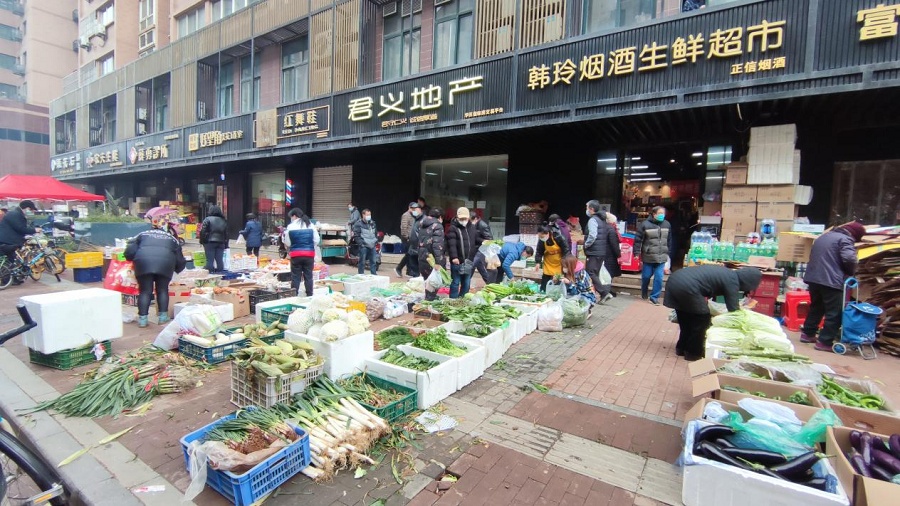 走出超市,漫步街邊,沿街陸續(xù)開業(yè)的小商鋪,同樣展現(xiàn)著這個(gè)城市久違的活力。在楓葉廣場(chǎng)2期小區(qū)西南門,正在營(yíng)業(yè)的蔬菜店、水果店生意很是不錯(cuò),新鮮的茄子、青筍、白菜用紙箱裝著,被整整齊齊地?cái)[在沿街人行道上,不少市民正在選購心儀的菜品。