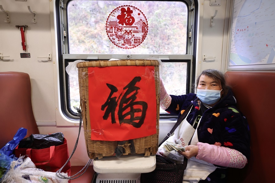 小慢車穩(wěn)穩(wěn)??吭诼躁栜囌?,一個個貼著福字的背簍滿載著沿線老鄉(xiāng)的希望與夢想奔向遠方……