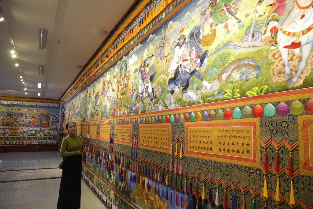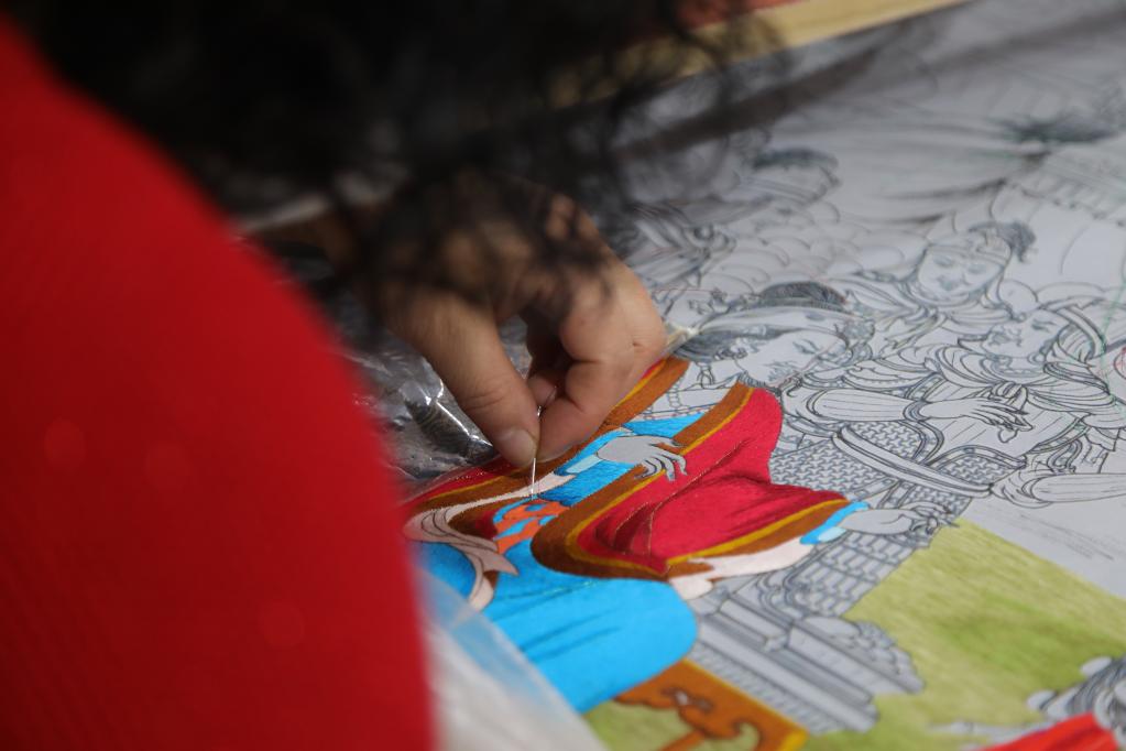 平滑的線條、細(xì)膩的針腳、傳統(tǒng)的繡法、新穎的設(shè)計(jì)……繡坊內(nèi),繡娘們聚精會神穿針引線,拉毛葉忠仔細(xì)檢查繡娘們的作品,用藏繡技藝講述格薩爾王的故事是一次創(chuàng)新。