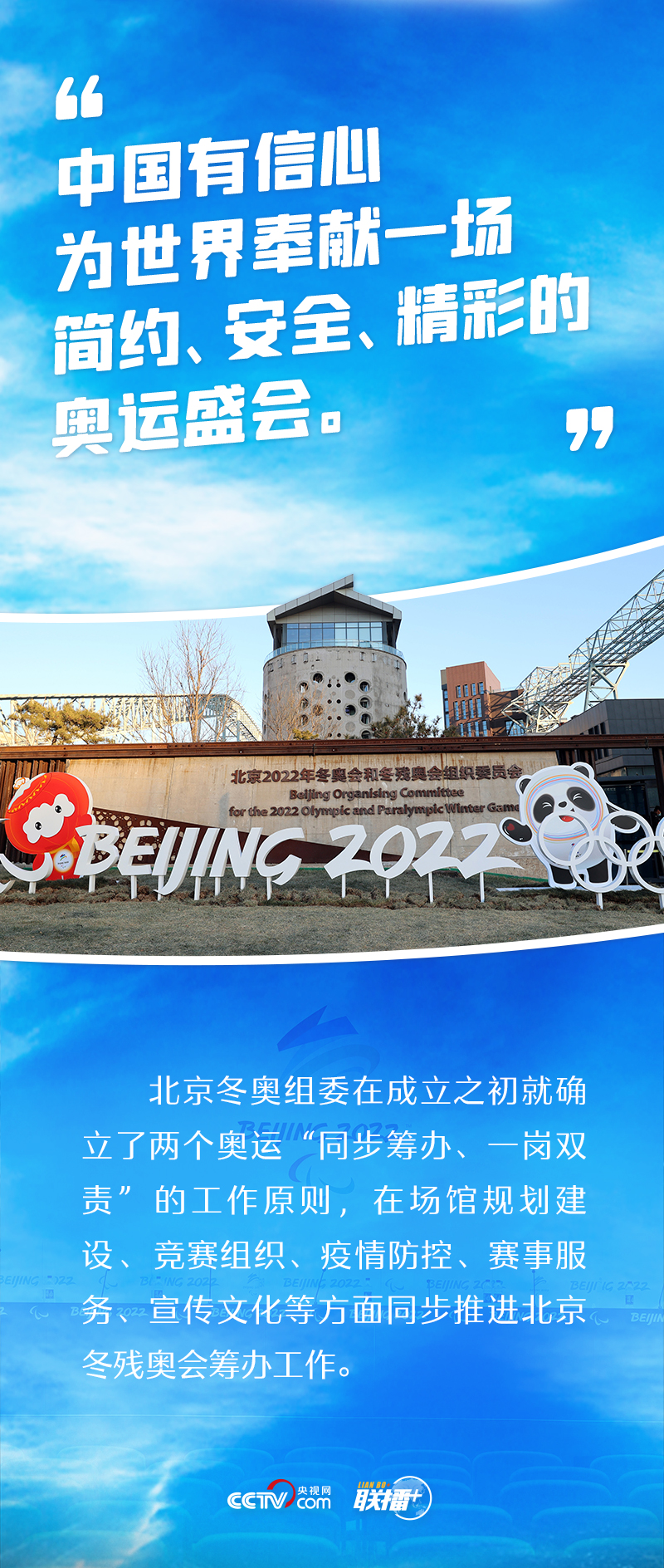 “兩個奧運(yùn),同樣精彩”,這是中國的莊嚴(yán)承諾。2015年夏天,北京攜手張家口獲得2022年冬奧會和冬殘奧會舉辦權(quán)。此后六年多,北京冬奧組委始終堅持兩個奧運(yùn)“同步籌辦、一崗雙責(zé)”的工作原則,在場館規(guī)劃建設(shè)、競賽組織、疫情防控、賽事服務(wù)、宣傳文化等方面積極推進(jìn)籌辦工作,努力為廣大運(yùn)動員提供一流的競賽場地和賽事服務(wù),創(chuàng)造良好的參賽體驗和參賽環(huán)境。