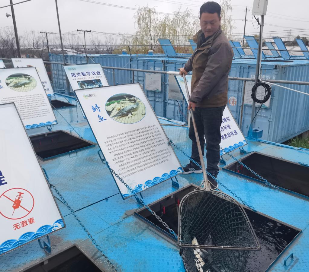 在良莊農(nóng)業(yè)科技園里,一排排藍(lán)色集裝箱,以及寫(xiě)著“養(yǎng)殖箱體全程模擬自然生態(tài)環(huán)境,還您江湖魚(yú)的味道”等字樣的標(biāo)牌,別有一番趣味。記者了解到,這里是一個(gè)智慧漁場(chǎng),裝滿水的集裝箱則是鱘魚(yú)、鱸魚(yú)、鯽魚(yú)等的“家園”,打開(kāi)一個(gè)集裝箱的頂部,三五成群的魚(yú)兒在約15平方米的水里游來(lái)游去。