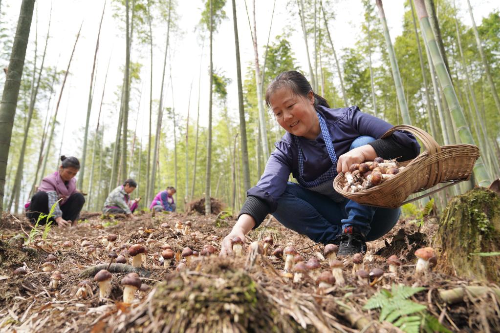 4月19日,農(nóng)民在貴州省赤水市寶源鄉(xiāng)回龍村竹林間采收赤松茸。新華社發(fā)(張鵬 攝)