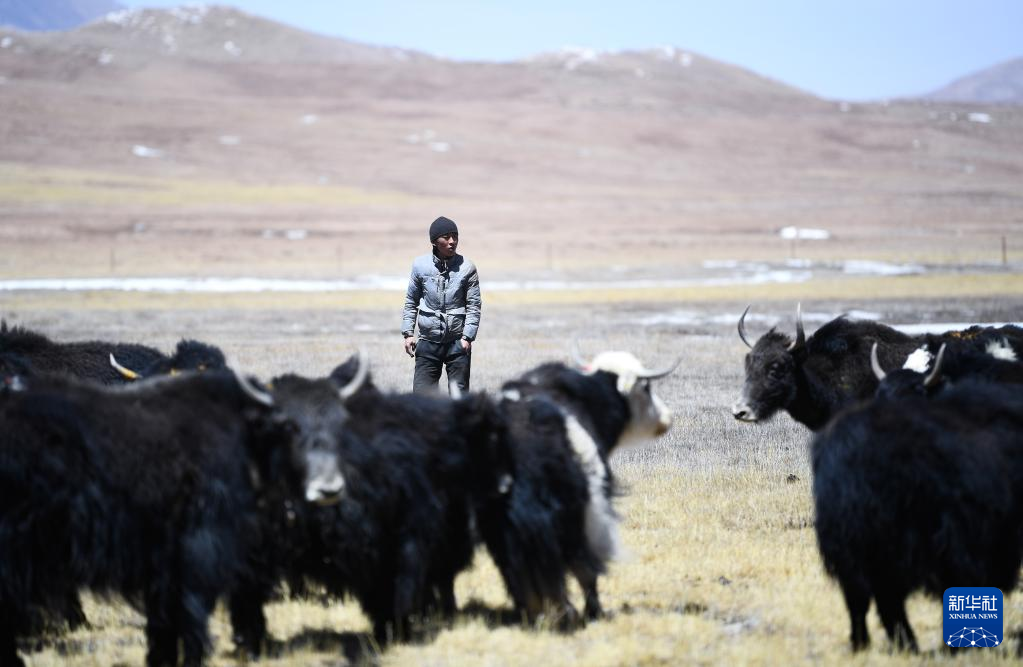 4月20日,在青海省玉樹藏族自治州曲麻萊縣,牧民在放牧。