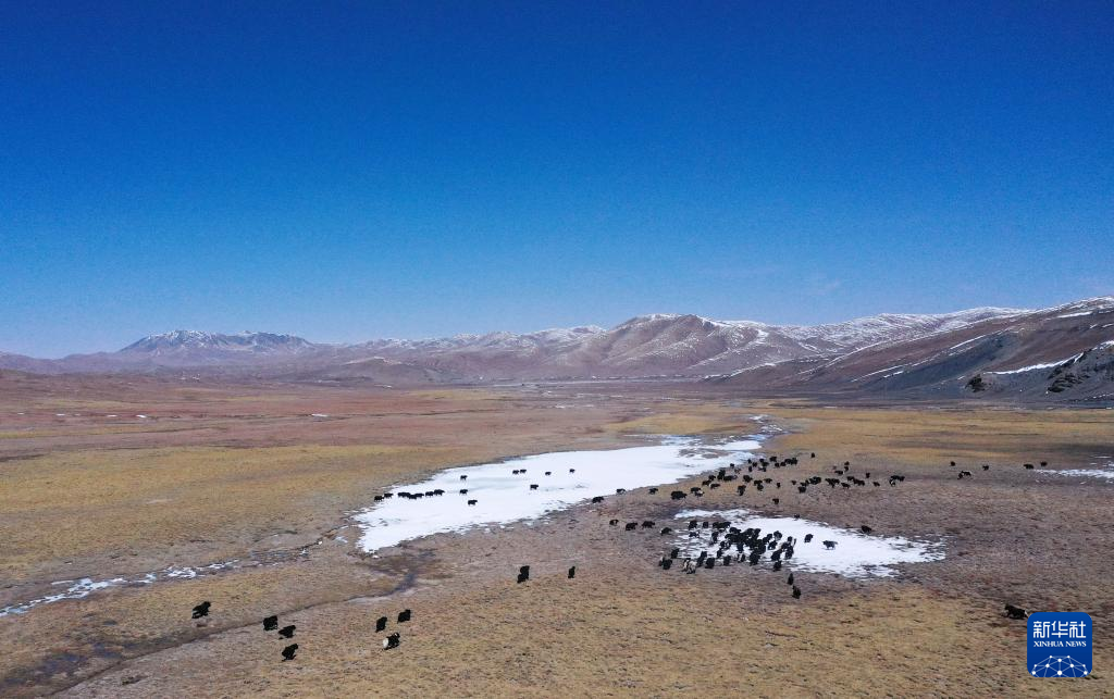 4月20日,在青海省玉樹藏族自治州曲麻萊縣,牦牛在草原上覓食(無人機照片)。