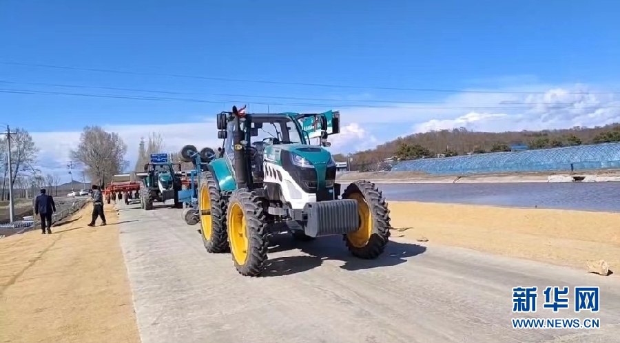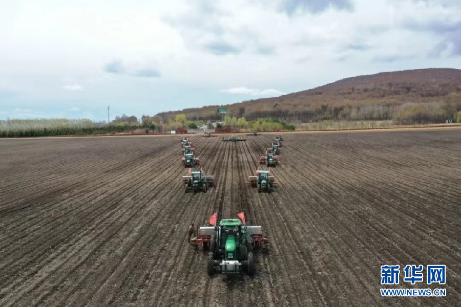 北大荒集團(tuán)建三江分公司八五九農(nóng)場(chǎng)有限公司數(shù)十臺(tái)大馬力巨無(wú)霸農(nóng)機(jī)在田間播種大豆。新華網(wǎng)發(fā)(李明達(dá) 攝)