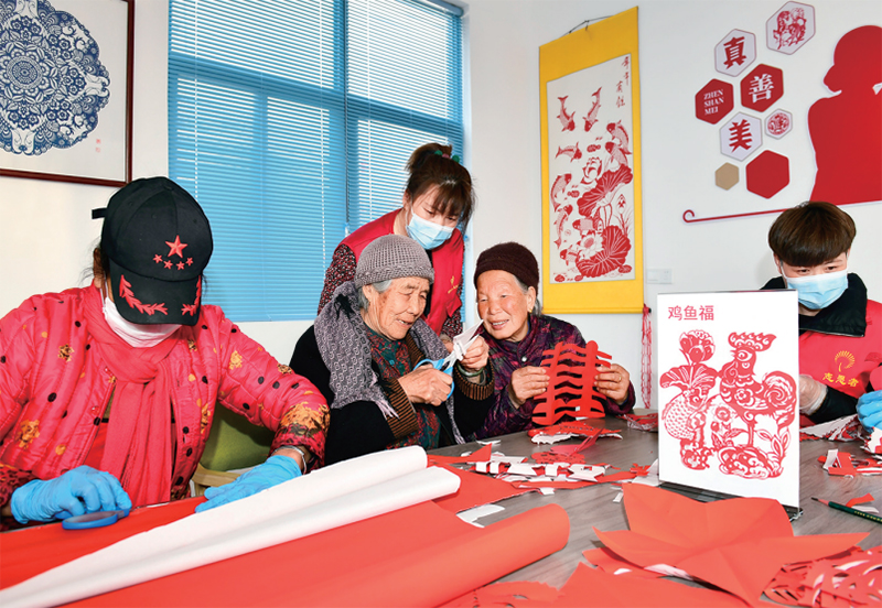 山東省日照市嵐山區(qū)按照就近、普惠原則建設(shè)養(yǎng)老服務(wù)中心,并組建志愿服務(wù)隊(duì)為老人提供助餐、助潔、助醫(yī)等愛(ài)心服務(wù)。圖為2022年2月27日,志愿者在日照市嵐山區(qū)虎山鎮(zhèn)黃家峪村養(yǎng)老服務(wù)中心陪老人剪紙、聊天?!⌒氯A社記者 郭緒雷/攝