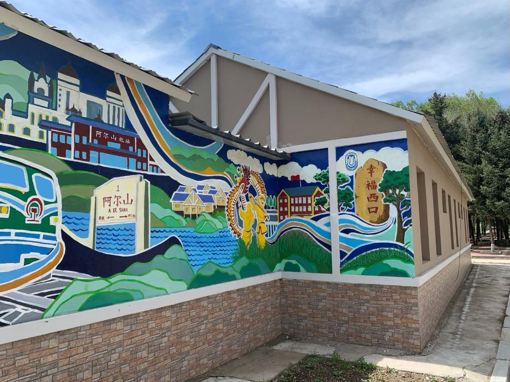 在西口村黨群服務(wù)中心,幾十面墻壁滿是各色墻繪,艷麗而靈動,灰頭土臉的老房子一下“活”了起來。這些作品都是近幾年創(chuàng)作的。尤其在2021年,西口村舉行了第一屆阿爾山市鄉(xiāng)村墻繪藝術(shù)大賽,上海大學(xué)上海美術(shù)學(xué)院、浙江藝術(shù)職業(yè)學(xué)院、廣州美術(shù)學(xué)院附中等8所院校,近千人次來到西口村,長達(dá)數(shù)月進(jìn)行墻繪創(chuàng)作,總創(chuàng)作面積超1000平方米。