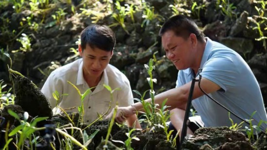 施茶村黨委書記洪義乾(右)查看火山石斛長勢(shì)。受訪者供圖