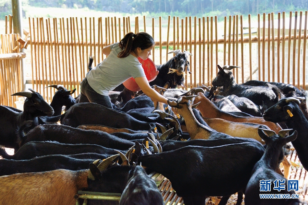 農(nóng)戶(hù)正在給黑山羊投放飼料。新華網(wǎng)發(fā) 趙志岸 攝