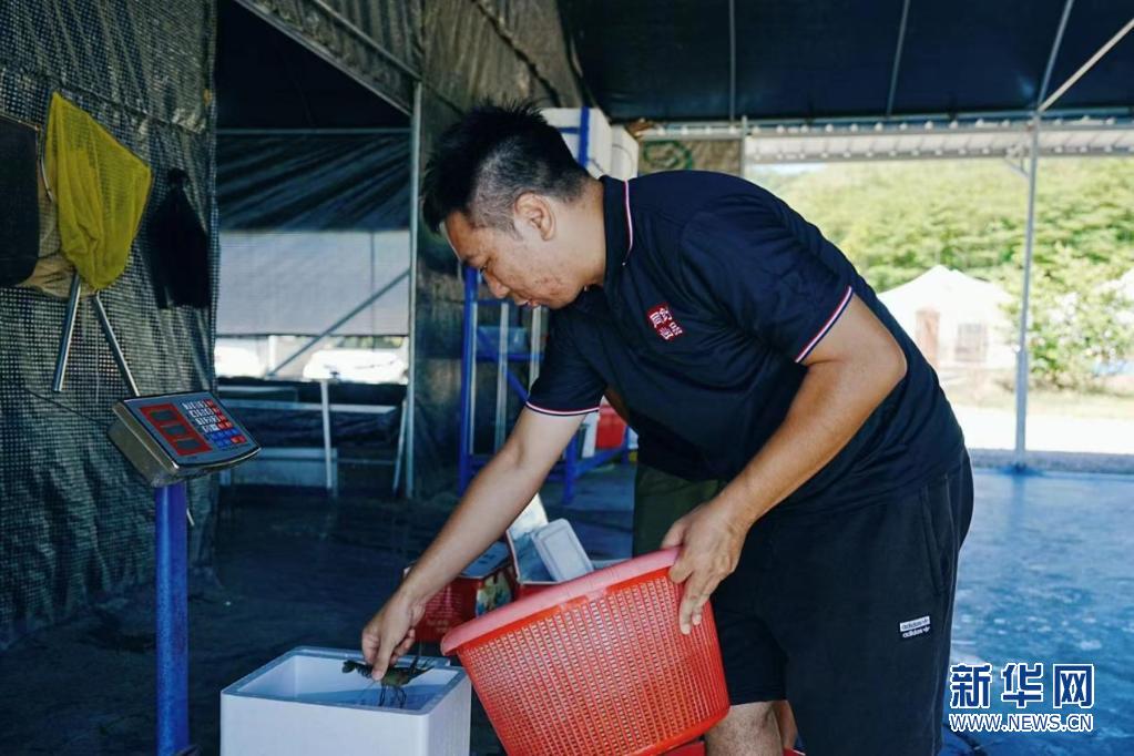 張銘華將小龍蝦稱重。新華網發(fā) (張羲輪 攝)