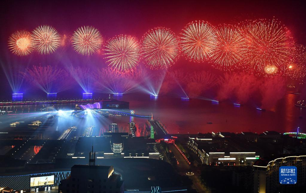 這是在青島舉行的《有朋自遠(yuǎn)方來》燈光焰火藝術(shù)表演(2018年6月9日晚攝)。2018年6月9日至10日,上海合作組織成員國(guó)元首理事會(huì)第十八次會(huì)議在青島召開。新華社記者 李紫恒 攝