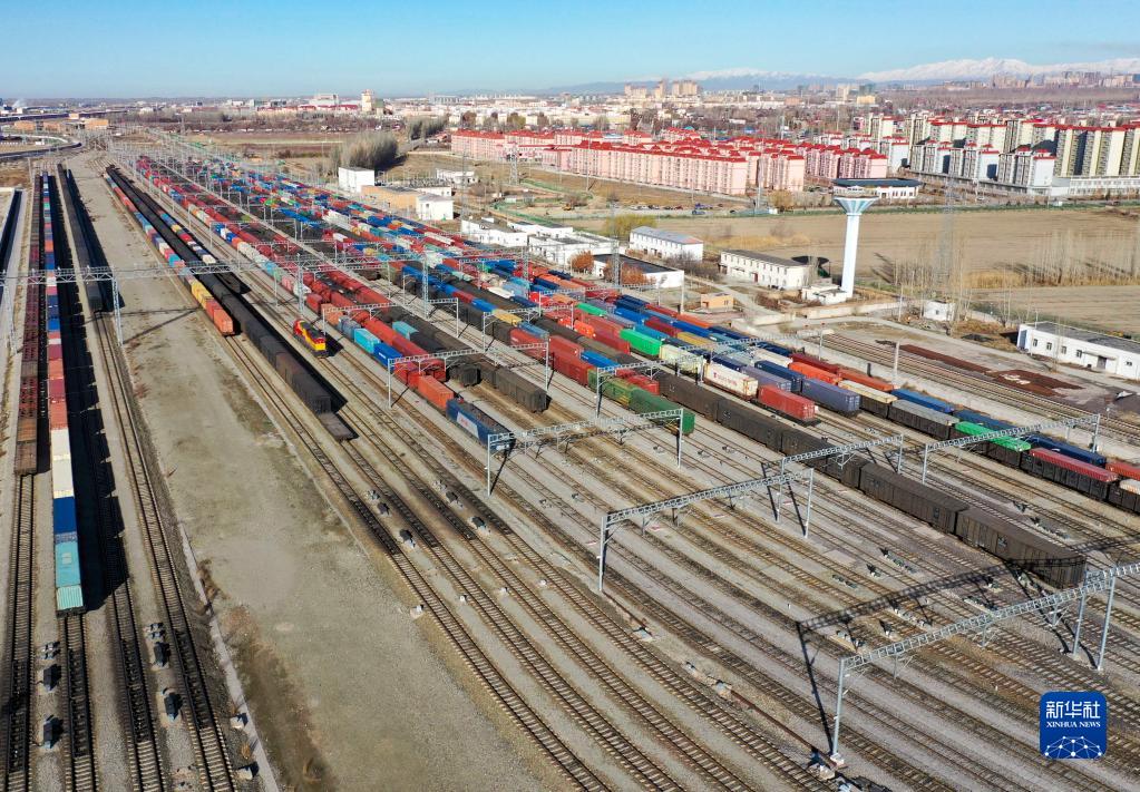 這是新疆霍爾果斯鐵路口岸(2022年3月31日攝,無(wú)人機(jī)照片)。新華社發(fā)(吳志恒 攝)