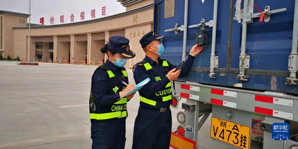 海關(guān)現(xiàn)場(chǎng)關(guān)員在喀什綜合保稅區(qū)登記入?yún)^(qū)車輛電子鎖信息(2022年9月14日攝)。新華社發(fā)(圖爾罕·麥麥提伊敏 攝)