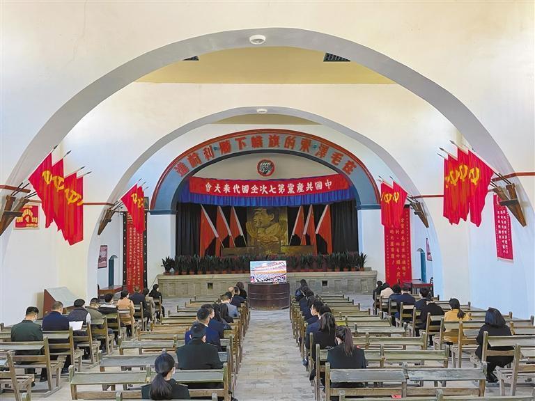 10月16日,延安革命紀念地管理局的40多名黨員干部職工在楊家?guī)X革命舊址中共七大會址集中收看黨的二十大開幕會。記者 陳宏江攝