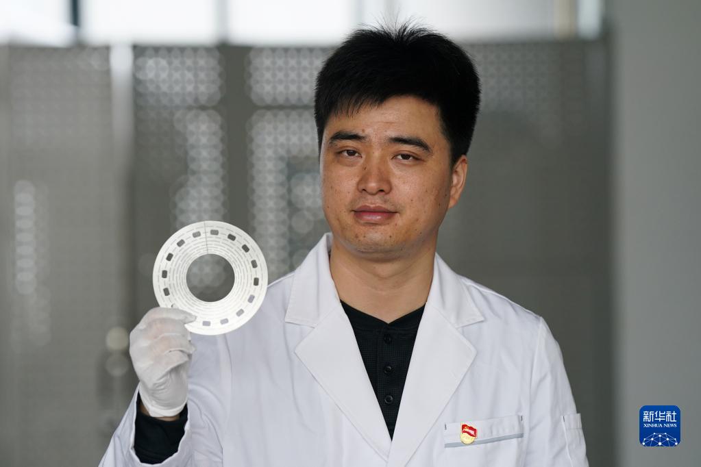 10月17日,在中國科學(xué)院合肥物質(zhì)科學(xué)研究院強(qiáng)磁場科學(xué)中心,副研究員房震展示水冷磁體線圈的核心組件——比特片。新華社記者 杜宇 攝