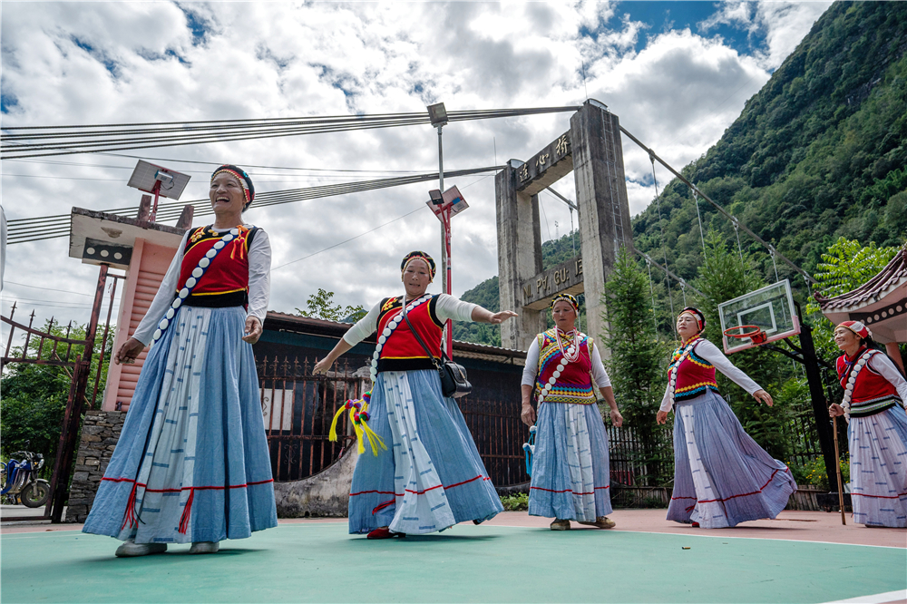 云南省怒江州福貢縣石月亮鄉(xiāng)拉瑪?shù)状宕迕褡园l(fā)組成的“奮進(jìn)合唱團(tuán)”在村委會排練節(jié)目(2022年9月14日攝)。2020年,怒江州26.96萬貧困人口全部脫貧,249個(gè)貧困村全部出列,4個(gè)貧困縣(市)全部摘帽。新華社記者 江文耀 攝