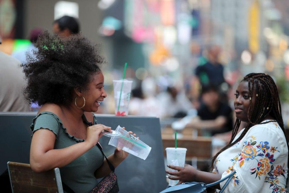 2018年7月2日,在美國紐約市時(shí)報(bào)廣場,人們喝水休息。(新華社記者王迎攝)