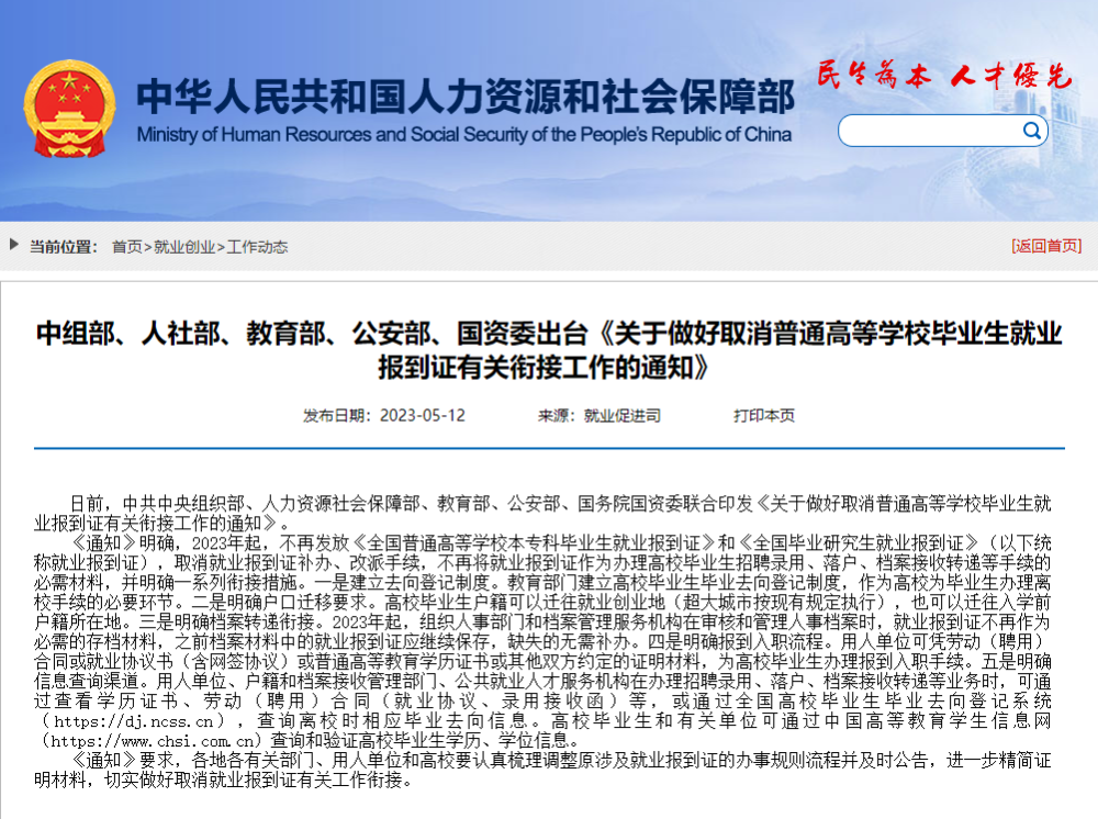 出臺(tái)《關(guān)于做好取消普通高等學(xué)校畢業(yè)生就業(yè)報(bào)到證有關(guān)銜接工作的通知》