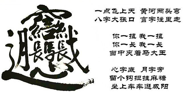 可“biang”字怎么寫(xiě)?秀才拿出筆墨,寫(xiě)出了以下口訣:一點(diǎn)飛上天,黃河兩邊彎;八字大張口,言字往里走,左一扭,右一扭;西一長(zhǎng),東一長(zhǎng),中間加個(gè)馬大王;心字底,月字旁,留個(gè)勾搭掛麻糖;推個(gè)車(chē)車(chē)逛咸陽(yáng)。于是就有了今天的“biang”字。