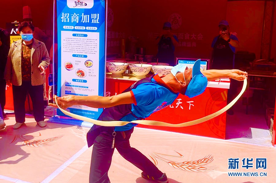 在第三屆陜西面食大會(huì)現(xiàn)場(chǎng),一位面食師傅表演甩面。新華網(wǎng) 楊喜龍 攝