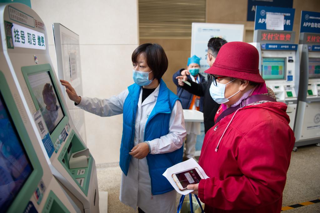 2020年12月9日,在首都醫(yī)科大學(xué)附屬北京天壇醫(yī)院,工作人員在幫助老年人使用自助機(jī)查詢號源。新華社記者 陳鐘昊 攝
