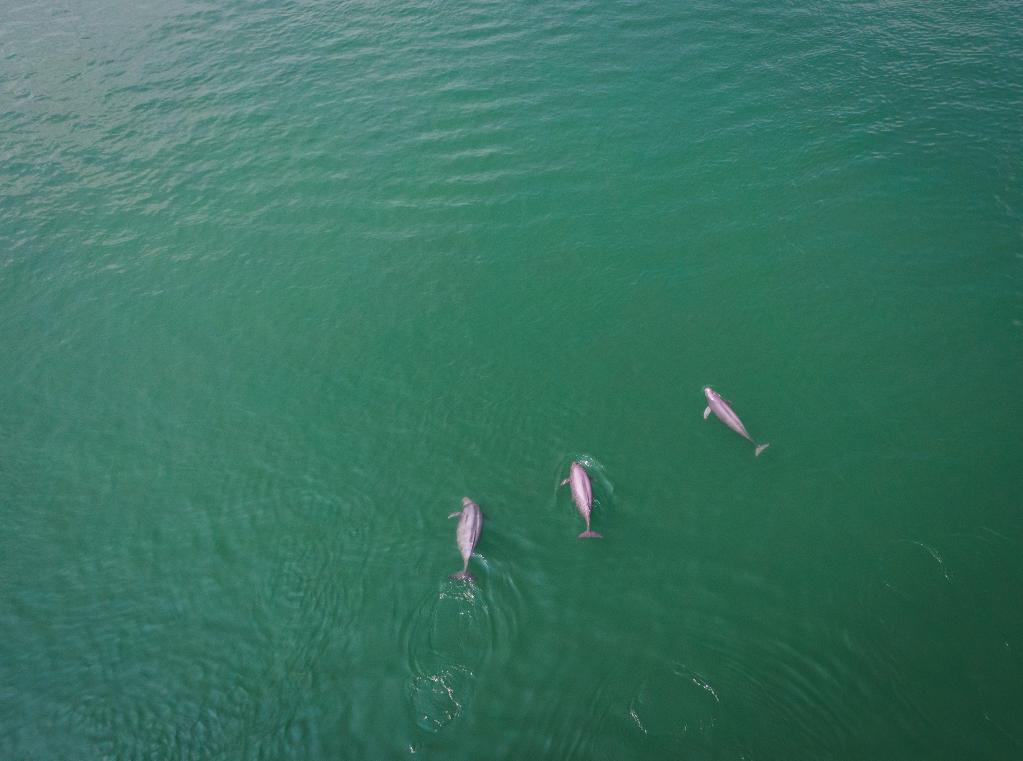 長江江豚在水中嬉戲(2021年5月11日攝,無人機照片)。新華社記者肖藝九 攝