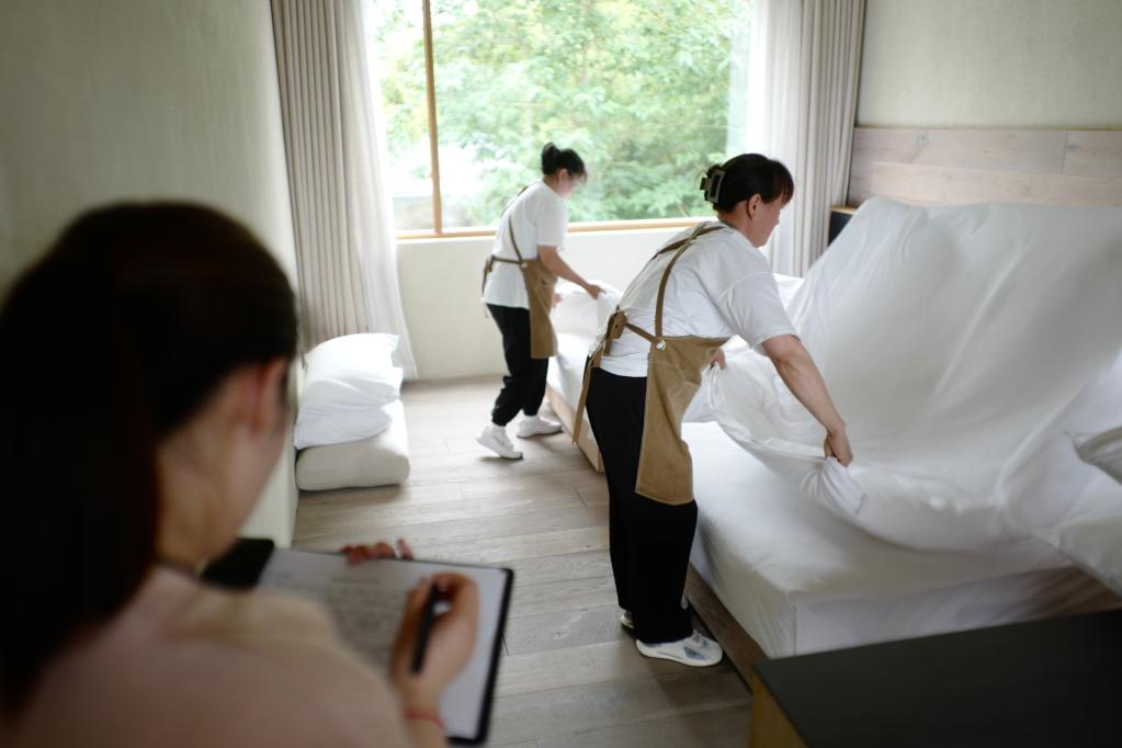 學員在莫干山民宿管家培訓中心內(nèi)進行房務考核。新華社記者徐中哲 攝