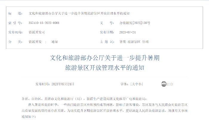 通知中稱,進(jìn)入暑期和旅游旺季,一些熱門旅游景區(qū)出現(xiàn)預(yù)約難等問題,影響了游客體驗(yàn),景區(qū)服務(wù)與人民群眾對(duì)旅游景區(qū)高質(zhì)量發(fā)展的期待還存在差距。為切實(shí)提升暑期旅游景區(qū)開放管理水平,更好滿足人民群眾旅游需求,現(xiàn)就有關(guān)事項(xiàng)通知如下: