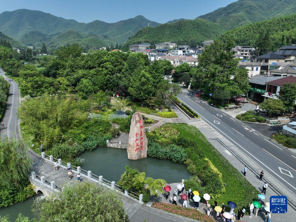 8月11日,游客在安吉余村的綠水青山間參觀(無人機照片)。