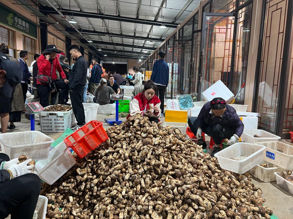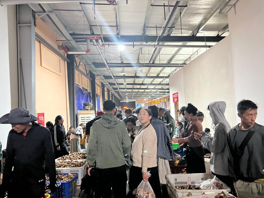晚上11時,記者走進(jìn)當(dāng)?shù)厮扇捉灰资袌觯吹娇蜕淘萍?,門店前滿是用松茸堆成的小山。雖已入夜,市場內(nèi)人聲鼎沸,商戶達(dá)瓦央宗熱情地拉住記者,推銷自家采摘的松茸。詢問得知,這段時間,她和家人每天凌晨3點(diǎn)半摸黑出門,沿著山道來到家附近的青杠林采摘新鮮松茸,然后來市場交易,有時一忙就要持續(xù)到深夜。“一個松茸季下來,家里能增加五六萬元的收入。”