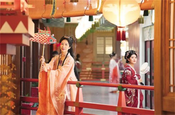陜西省西安市長安十二時(shí)辰主題街區(qū)內(nèi),游客身著唐代服裝,漫步于市井街巷,體驗(yàn)唐代民俗風(fēng)情并拍照留念。