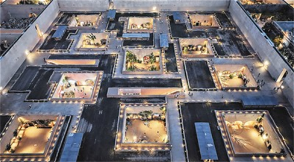 這座“戲劇幻城”從盲盒中創(chuàng)意取材,用夯土城墻合圍出方正的空間,并劃分出56個(gè)完全不同的格子,打造了21個(gè)劇場和不同風(fēng)格的景觀院落。游客可以在格子中穿行,分別進(jìn)入不同時(shí)期、不同主題的戲劇空間觀演。置身其中,在LED光影技術(shù)、“聲光電畫”一體化數(shù)控系統(tǒng)的輔助下,游客可以回到紅廟學(xué)校,重溫童年時(shí)的課堂時(shí)光;“穿越”到1942年,體驗(yàn)李家村人逃荒的艱辛;來到“天子駕六遺址坑”與想要預(yù)見未來的周天子進(jìn)行“時(shí)空對話”……