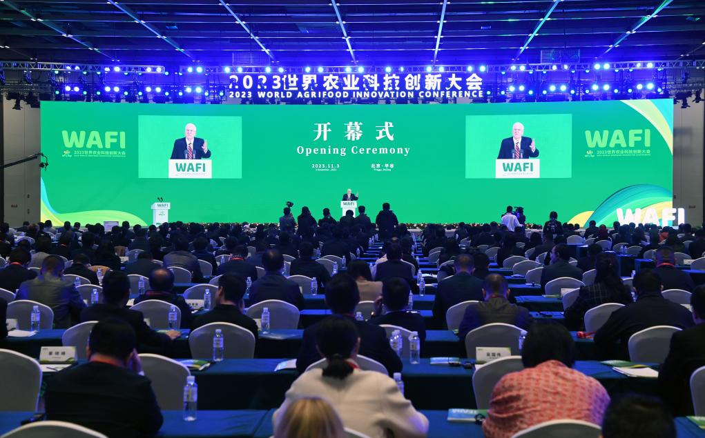 11月3日,世界糧食獎(jiǎng)基金會(huì)榮譽(yù)主席肯尼思·奎因在2023世界農(nóng)業(yè)科技創(chuàng)新大會(huì)開(kāi)幕式上致辭。新華社記者 任超 攝