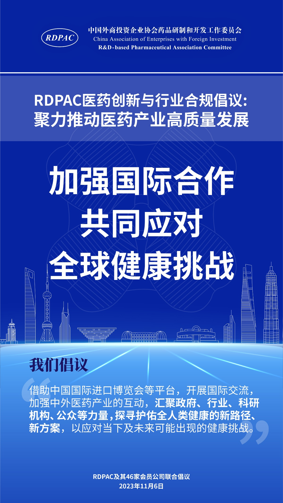 11月6日,中國外商投資企業(yè)協(xié)會藥品研制和開發(fā)工作委員會 (以下簡稱 “RDPAC”)及其成員公司在華負責人共同發(fā)起“RDPAC醫(yī)藥創(chuàng)新與行業(yè)合規(guī)倡議”,致力于打造充滿活力的醫(yī)藥創(chuàng)新生態(tài)系統(tǒng)、完善的行業(yè)合規(guī)體系,聚力推動中國醫(yī)藥產(chǎn)業(yè)的高質(zhì)量發(fā)展,建設(shè)健康中國。