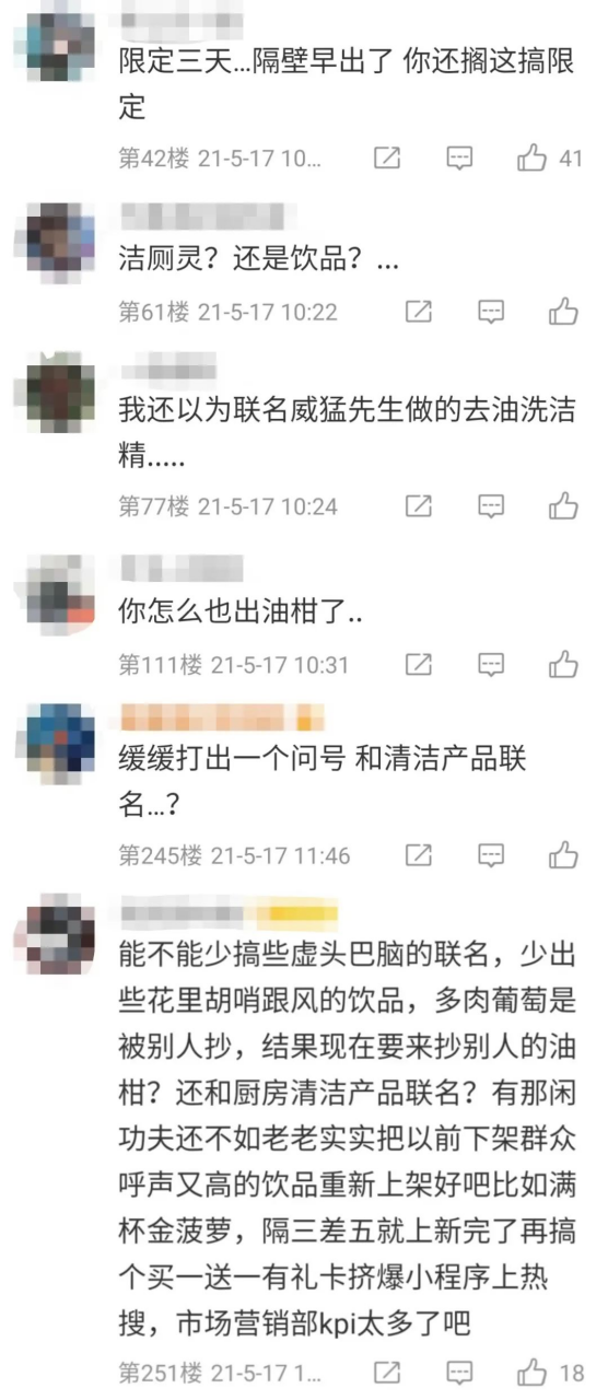 2021年5月,喜茶與清潔品牌威猛先生聯(lián)名推出油柑茶,其初衷本是借助威猛先生清潔去油的特質(zhì)突出聯(lián)名產(chǎn)品刮油解膩的特效,推出后卻被網(wǎng)友調(diào)侃道“這是潔廁靈還是飲品?” “緩緩打出一個(gè)問(wèn)號(hào)”……除此之外,在喜茶推出此聯(lián)名之前,已有其他品牌推出了油柑茶產(chǎn)品,有網(wǎng)友對(duì)此評(píng)論“你怎么也出油柑了……”。