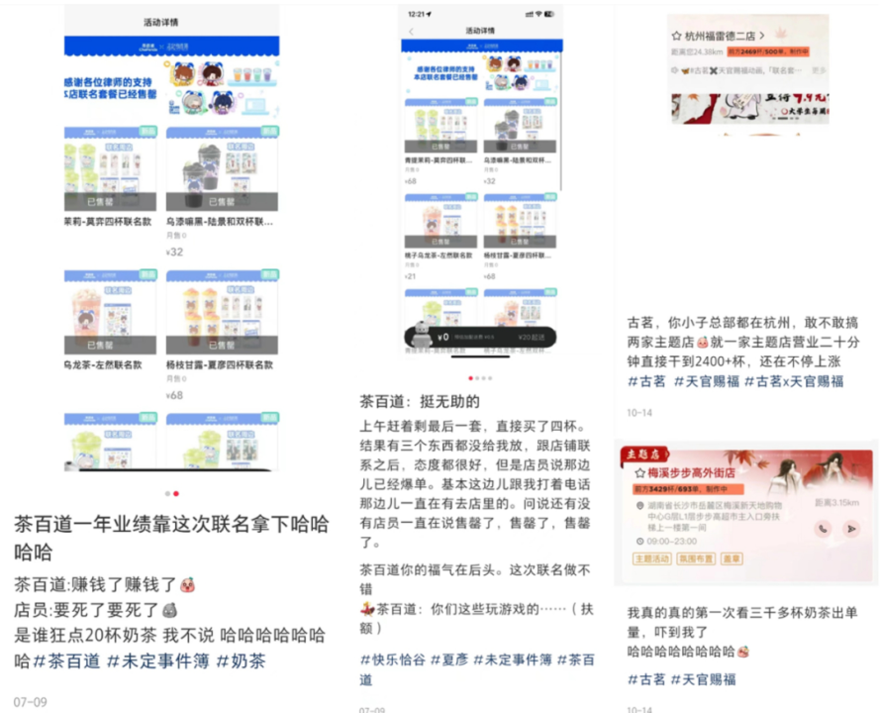 聯(lián)名在帶來(lái)高熱度的同時(shí)也讓茶飲店嘗到了爆單的甜頭。據(jù)網(wǎng)友在社交平臺(tái)分享,在茶百道與未定事件簿聯(lián)名活動(dòng)第一天,許多門店就已經(jīng)出現(xiàn)聯(lián)名套餐已售罄的標(biāo)識(shí);古茗與天官賜福聯(lián)名的線下主題店曾一度出現(xiàn)還有2000多杯甚至3000杯茶飲等待制作的現(xiàn)象。記者走訪了此前的聯(lián)名主題店,店員也回憶道:“當(dāng)時(shí)真的做不完!”