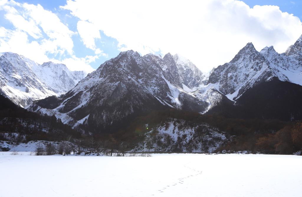 梅里雪山群峰和覆蓋白雪的冰湖(1月5日攝)。新華社記者關(guān)明輝 攝